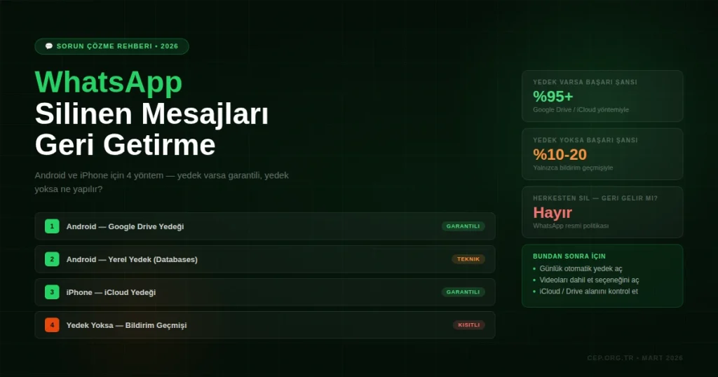 Tek istisna: mesaj silinmeden önce alınmış bir yedekte o mesaj bulunuyorsa, o yedek geri yüklendiğinde mesaj görünebilir. Ancak bu yedek geri yüklenince yedek tarihinden sonraki tüm mesajlar da silinir — dolayısıyla pratikte pek uygulanabilir değil.